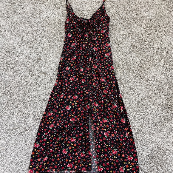 Black spaghetti strap dress with flower print. Buttons down and ties around the chest.