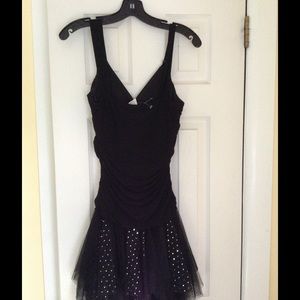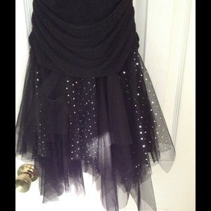 Black rouged dress with rhinestone at the bottom of the straps and ruffled bottom with sparkles