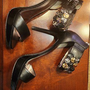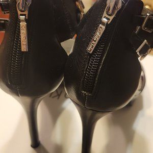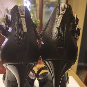 Black stiletto shoes from Calvin Klein, size 8.5M. Perfect for summer but can be worn in any season and can be dressed up or paired with some skinny jeans🔹️ Condition: Used and are like new. No visiblescratches, nicks, or dents. 🔹️Details: Leather upper with coin/medallion detail, ankle cuff. Zip closure in the back, 4" heel. 🔹️Shipping specifics: Item comes from a smoke free home. Ships within 24 hours of receipt of payment.