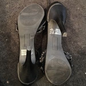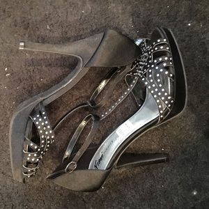 Black strappy stiletto with rhinestones. About four inch heels. Never been worn. Black satin material.