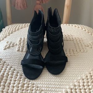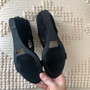 7.5 TTS. Strappy black wedge heels with cute cutout on the sides. Smoke free / pet free home. Never worn. 2 1/2” heel.