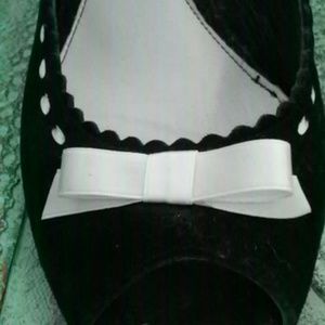 Black suede peep toe shoes with scalloped edge and ivory ribbon, with ivory bow. Worn a couple of times, heel in perfect condition.