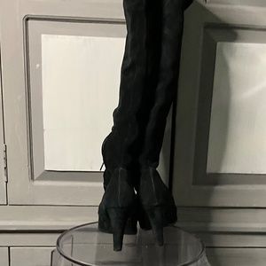 Black boots that can be worn at knee length or folded up to hit approximately 4” above knee. ( depending on height) When suede is folded down, it has a leather fabric that enhances the boot. Rounded toe to help with comfort. There is a zipper in inside of boot at the ankle!