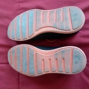 Black tennis shoes, combination suede (top around laces) and structured canvas (body of shoe). Orange soles and laces. In excellent condition, only worn a few times. From Italian shoe brand, I think it's Zu (the interior font is hard to read). Size 9 regular.