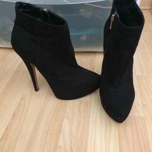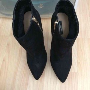 Classy bootees, pre owned condition. There is one stain on top of one shoe, could possibly be removed. Pointy toe, high heel.