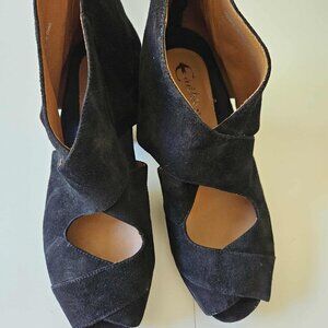 Black, butter soft suede, peep toe booties, zip up back closure. Size 10M Worn once, like new/