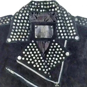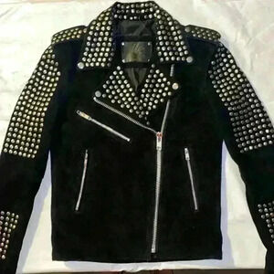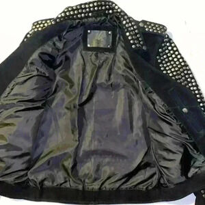 INSANELY COOL BLACK SUEDE STUDDED JACKET! Words can not describe how good this is. Size is marked as XS, but please refer to measurements, as I believe this is a men’s XS , will probably fit up to a women’s medium.