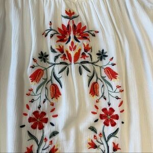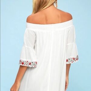 Let the Black Swan Taryn White Embroidered Off-the-Shoulder Shift Dress make your day! This breezy shift dress is perfect for the heat with its lightweight woven fabric that sweeps from a smocked, elasticized, off-the-shoulder neckline, into a relaxed shift silhouette. Lovely pink, red, yellow, green, and black floral embroidery dances over the front and short flounce sleeves.