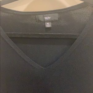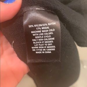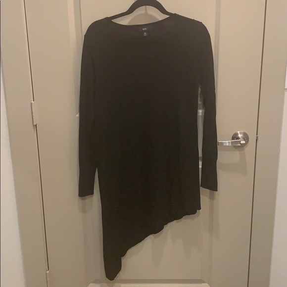 Black sweater with asymmetric bottom- perfect with leggings and boots! I’m 5’7 and it was the perfect length for me. Can be dressed up or down.