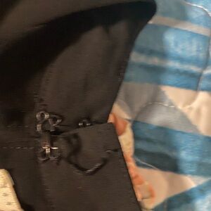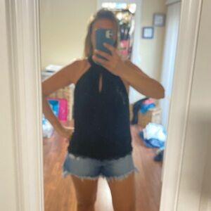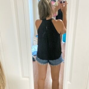 Black tank top in excellent condition except the top button fell off(easy fix) or you can wear with only the 2nd one latches. It must have fell off in the wash. Only worn once. Has a small fringe bottom.