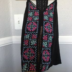 This never worn tank top. Had a color sewn detailing in the front. With an crochet line down the middle. And a crocheted back.