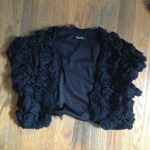 Black shrug with polyester rosette texture. Worn once to a wedding. Very versatile. Flattering and unique.