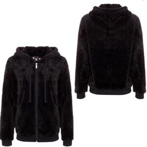 Black full zip hoodie with pockets and ribbed bottom hem and cuffs, and drawstring hood in soft, thick plush faux fur inside and out is perfect for those chilly days or nights and is so comfortable it's sure to be a favorite! Plush 100% polyester faux fur