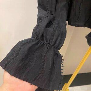 A black top hangs on a hanger emblazoned with the words "Unique charm." Its unique design features ruffles at the neckline, adding a touch of femininity. The bodice is embellished with delicate stitching and beads, showcasing thoughtful details. The long sleeves, with flared cuffs, create an elegant yet unique style, perfect for a variety of fashionable looks.
