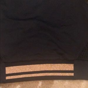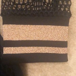 Adorable top that could be dressed duo or way down. Fishnet detail on sleeves and goldish/bronze metallic stripe at cuff and bottom hem.
