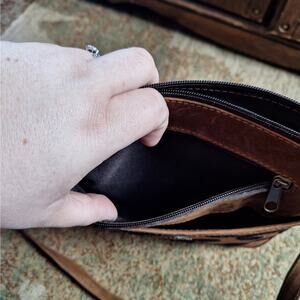 Brown Suede Leather Crossbody with Black Velvet Roses, Multiple Pockets, Adjustable Strap.