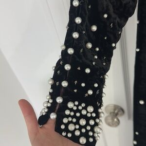 This beautiful black velvet dress from Anthropologie, is perfect for any holiday party or fancy night out. It’s covered in gems and pearls, it has a slit on the left side that I tried to sow but you can always remove it. The sleeves are beautiful, they grab you at your wrist. A couple of the pearls have fallen out but nothing too noticeable. Runs a little big, worn once.