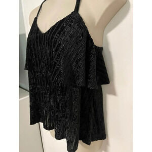 Black velvet halter top with pleats, ruffles, and tie-back straps size M #0258