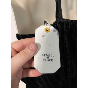 Back: Thin halter straps tie at the neck, leaving the upper back open. The fabric continues with the same ribbed velvet texture, maintaining a sleek and cohesive look. A white tag suggests it's new or being listed for sale.
