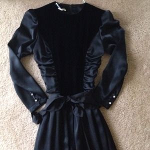 Black velvet bodice with cinched sides. Black silky material giving it a "faux leather look". Dress is from the 70's, has a vintage look. Rhinestone buttons on sleeves Tie around waist is not included and was only used for models purposes. Last photo shows the back of he dress. It zips up to the neck line, it was just too tight on the mannequin.