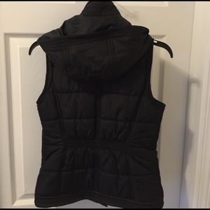 Like new, very warm, stitched, water resistant, black vest. Has pockets and a detachable (zip-off) hood. It zips closed as well as buttons up. It's lined and has a collar that has a soft lining.