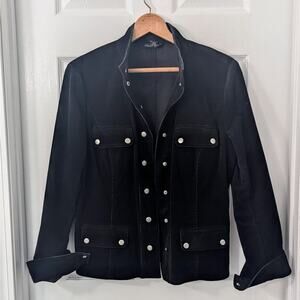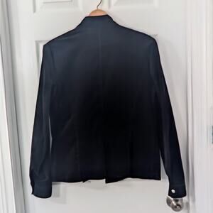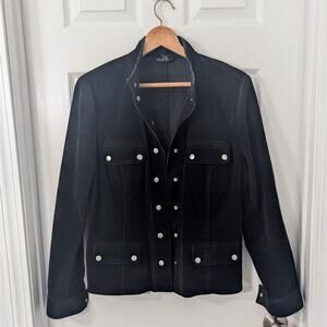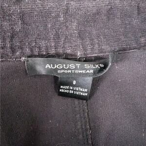 Vintage August Silk corduroy stretch jacket. Color: Black. Snap closure. 4 front pockets with snap closure. Size 8. Measurements laying flat: shoulder to shoulder 16 inches, armpit to armpit 19 inches, 24 inch length.
