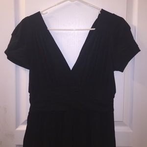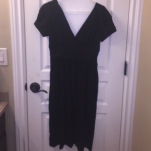 Black v-neck in front and back dress. It is fitted at the waist then comes out to more of an aline bottom. Hits below the knees.