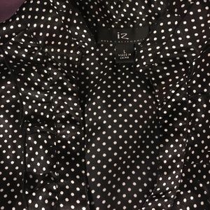 IZ Byer California size large black with white polka dots blouse. Has a ribbon belt to match and buttons up the front. Satin like material.