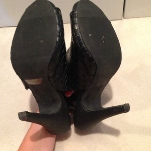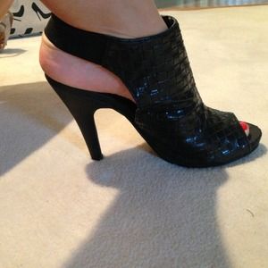 These black weave design black pumps have a peep toe opening and a heel strap in the back. They have a tiny 1/4 inch platform in the front with a 4 inch heel.