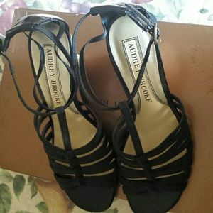 Gorgeous must haves...3.5" wedge black Audrey Brooke strapped heels. Size 6 with box, only worn twice