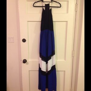Black top empire waist maxi dress with cute white chevron detail. Top black chevron is a see through mesh adding cute interest to the dress. Woven material can be worn dressy or casual. Lightly worn. By Arden B size small