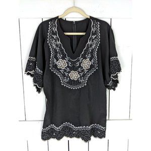 Black white floral embroidered bell sleeve pullover caftan blouse
