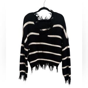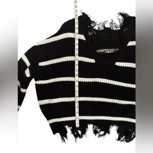 Black & white stripe oversized fray hem semi cropped sweater with drop shoulders