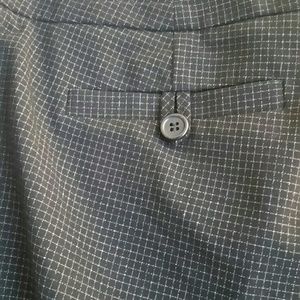 Black with thin white square pattern throughout. Light-weight fabric, 3 button wide waistband, pockets still sewn shut