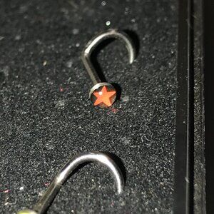 These are 18 gauge C-shaped nose rings. They each have a Design on them that is 3mm round. The nose ring design is Black with Red Star. This nose rings is 316-L surgical steel.
