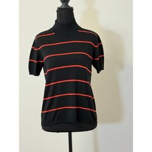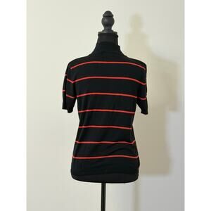 Add a pop of color to your wardrobe with this stylish black sweater featuring bold red stripes and short sleeves. This sweater is perfect for adding a touch of sophistication to any outfit. Whether you're dressing up for a special occasion or keeping it casual, this sweater is sure to turn heads.
