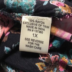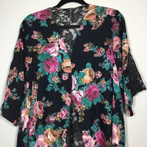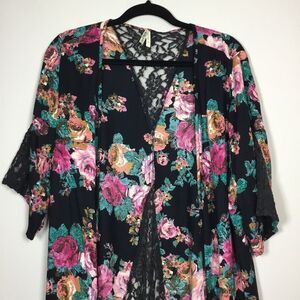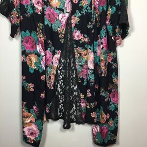 Good condition duster with lace panels on back and sleeves. Black with orange, teal, brown ,white, and pink flowers. Live 4 truth tag size XL. Part of hem was resewn please see pic.