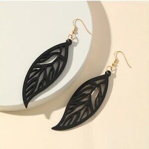 Black wooden carved stencil leaf shape earrings boho jewelry