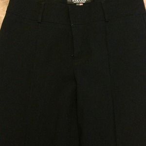 Black pants that have a very defined ribbing down the center crease with a cuff around the bottoms. I tried to picture it as best I could!! They are a different feeling material that is made up of 73% rayon, 24% polyester, and 3% spandex. Excellent, new quality.