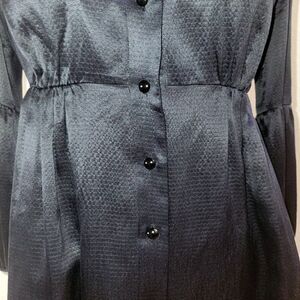 Features: beautiful silky long top with tie at the waist, short elastics on the front, bell sleeves from the elbow
