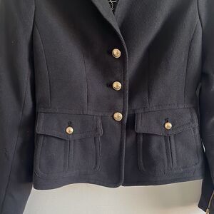 Gorgeous black blazer in excellent condition. Size XS. Buttons have a soft gold hue. Zippers on the sleeves. Two function, front button pockets