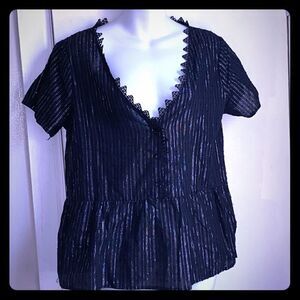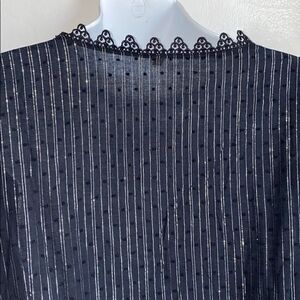 Black lightweight cotton /polyester blend blouse with embroidered dots for added texture and silver pinstripes. V neck, button down with flutter hem, lace trim. Size Medoum, measures 19” from armpit to armpit and 24” from top of shoulder to bottom hem. Washable.