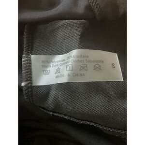 Women’s one-piece athletic-style swimsuit or romper in black with royal blue panels and contrast piping. Features short sleeves, a front zipper that adjusts from modest to deep plunge, and built-in lining in the bust area. Made of 80% polyamide and 20% elastane. Size Small. Made in China. Can be worn for swimming, water sports, or as a sporty fashion piece.