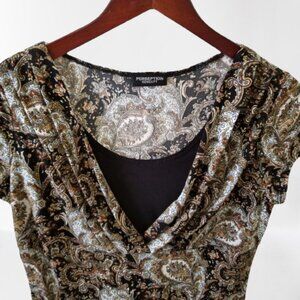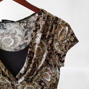 Silky soft blouse with short cap sleeves and scoop neckline. Front paisley fabric drapes down over black chest lining.