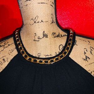 Black swing dress with gold chain collar. Slips overhead and hooks at the neck. In great condition