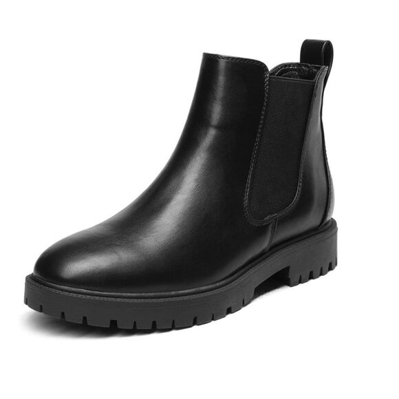 Black chelsea ankle boots made of faux leather. Comfortable and easy to pull on. Heel is 1.25 inches