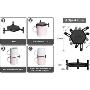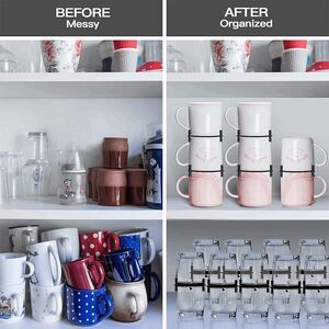 This cup organizer is an adjustable stacking device that saves space on cabinet shelves by stacking cups and cups in a narrow way to organize kitchen cabinets. Space saving. One size fits all cups. The expandable legs make it fully adjustable to fit most sizes and shapes of coffee cups, cups and glasses in your kitchen cabinets, sideboards and lockers