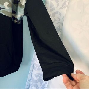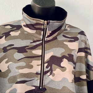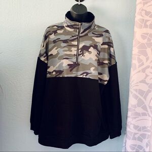 Cute black & camouflage 3/4 quarter zip pullover sweatshirt. Relaxed fit. Lapel turn down collar. Kangaroo pockets. Polyester/spandex fabric. Brand tags have been removed. NWOT. Washed but never worn. In excellent condition. Superior quality product. Size XL