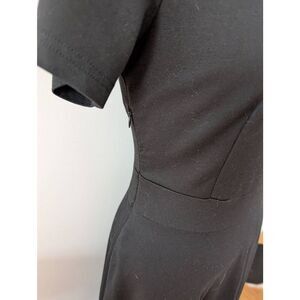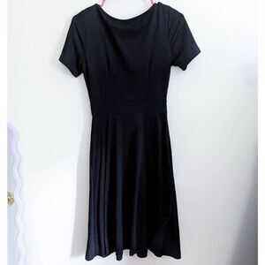 Black A-Line dress. Knee length short sleeve cotton dress with pockets. Side zip closure. Peter Pan collar, which I personally embellished with lace trim in a Wednesday Addams style.