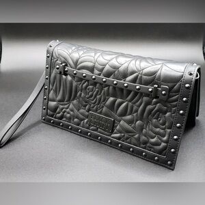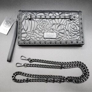 Ever needed a high end goth style clutch, here it is. Black clutch with Charlotte spider web style quilt design exterior. Faux leather with black inner fabric. Pockets inside. Magnetic clasp closure. Chain strap is adjustable.